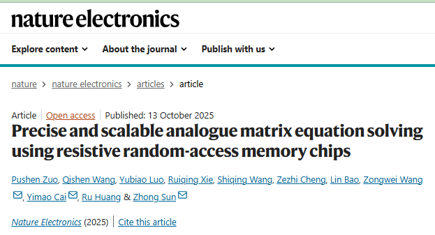 孙仲团队选择了一条融合创新的道路,通过新型信息器件、原创电路和经典算法的协同设计,构建了一个基于阻变存储器阵列的高精度、可拓展的全模拟矩阵方程求解器,首次将模拟计算的精度提升至24位定点精度。