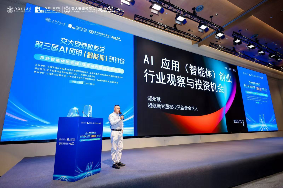 近日,由上海交通大学安泰经济与管理学院校友会与上海市漕河泾新兴技术开发区发展总公司联合主办的“交大安泰校友会第三届 AI 应用(智能体)研讨会”圆满成功举办!研讨会以 “奔赴智能体新征程·锚定 AI 应用创业新蓝海” 为主题,通过多维度的深度分享、圆桌论道,全景展示了 AI 智能体从基础模型进化到垂直行业落地的无限可能。超过 520 人火爆全场,有一半来自交大安泰校友,三分之二来自上海交通大学,此外还有来自各大 985 院校及海外名校校友。领航新界合伙人谭永献应邀做主题演讲:“AI应用(智能体)创业的行业观察与投资机会”,深度分享观点。